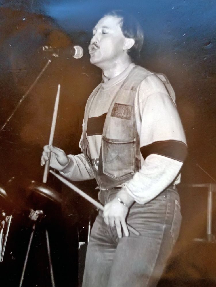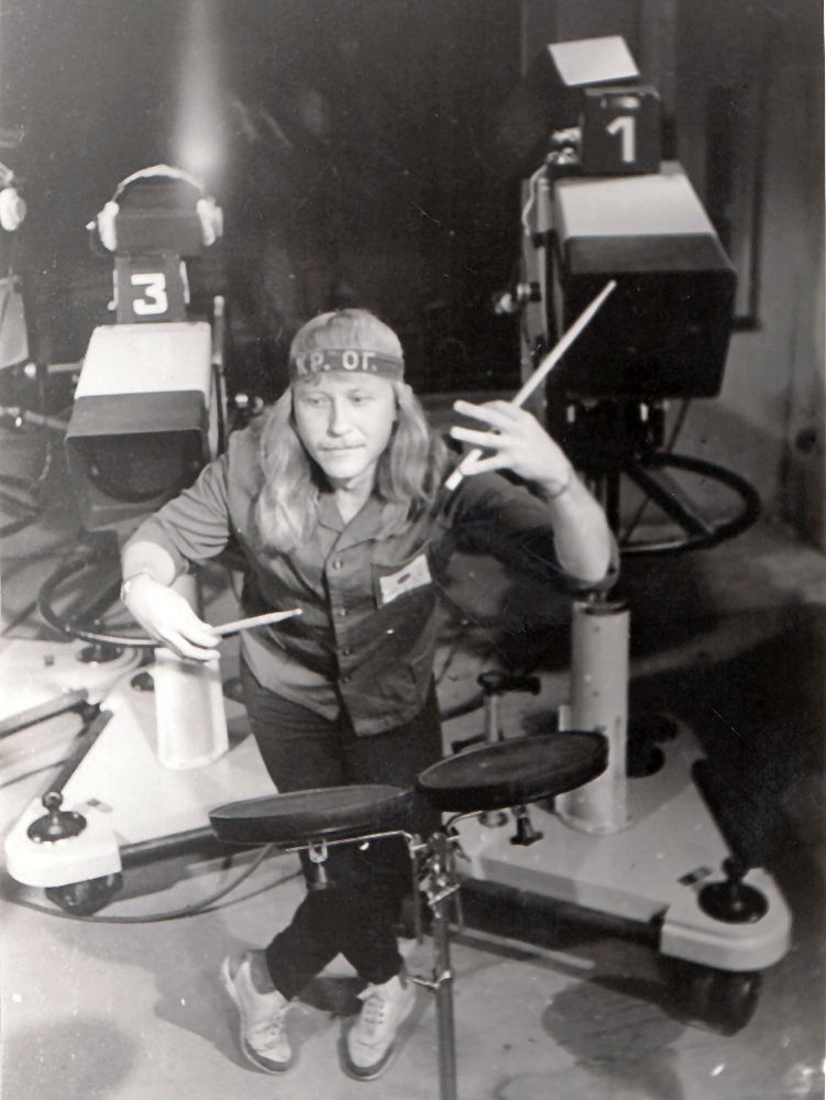 — Играю на барабанах, которые надо привести в порядок, починить. Вот они, стоят за спиной, — показывает он.