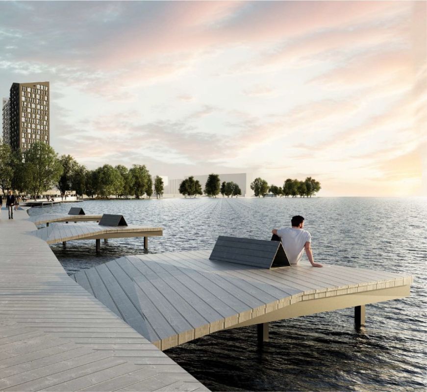 Помимо удобств в самом ЖК и на прилегающей территории рядом с Z-town застройщик проектирует благоустройство набережной с пирсами, понтонами и фотозонами.