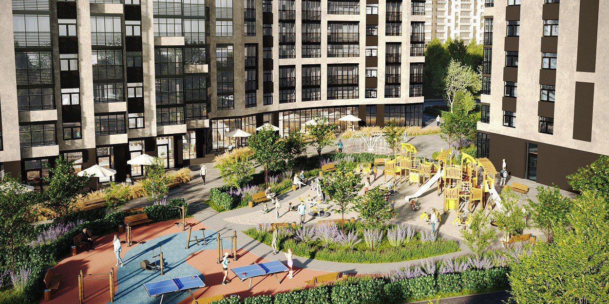 Первые этажи отведены под размещение магазинов формата «у дома», пунктов выдачи интернет-заказов, кафе, пекарен, парикмахерских и многого другого. Двор абсолютно свободен от автомобилей — они разместятся на отдельной территории, что позволит родителям спокойно гулять с детьми. Дополнительный комфорт и безопасность обеспечат системы видеонаблюдения, установленные по всему периметру.