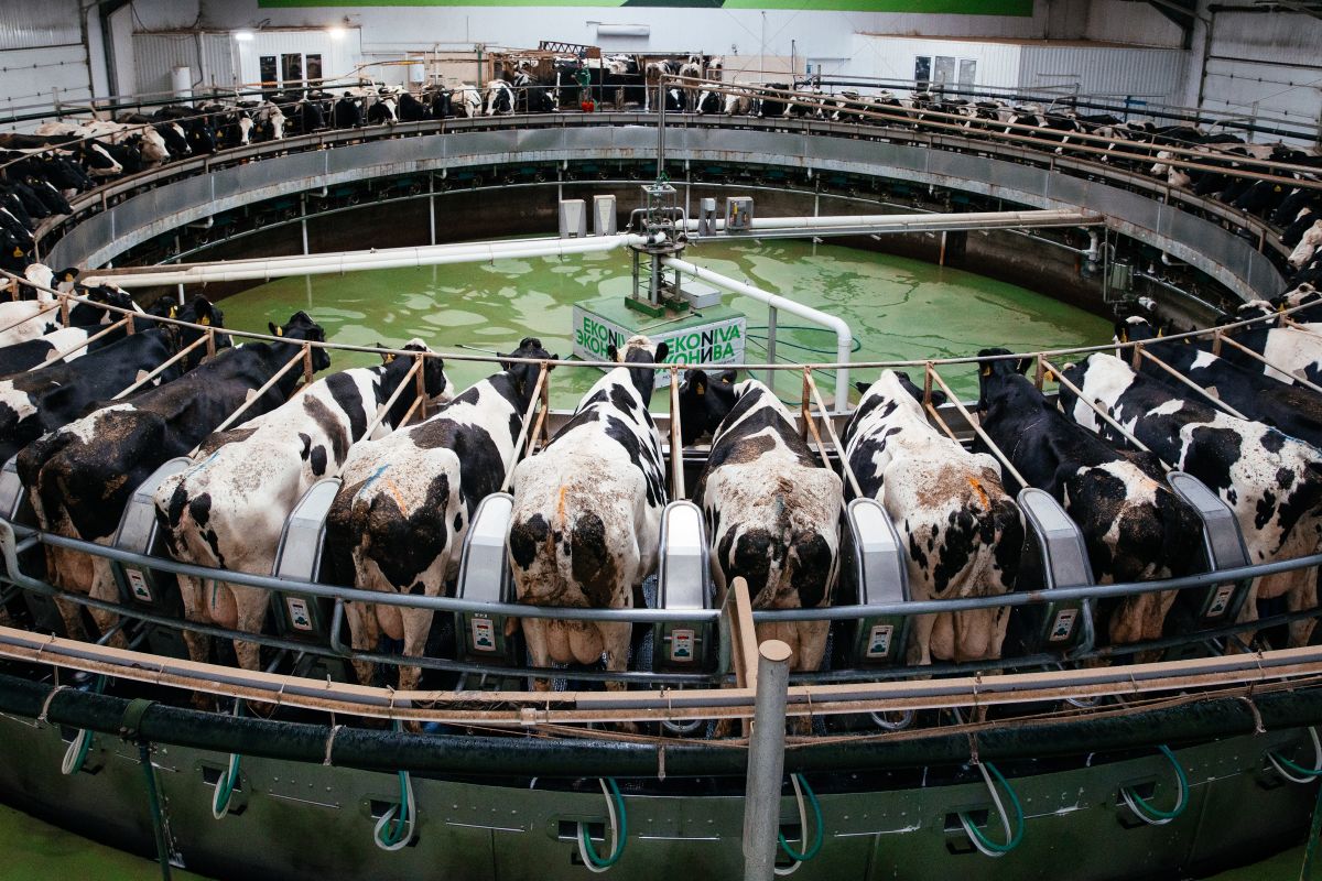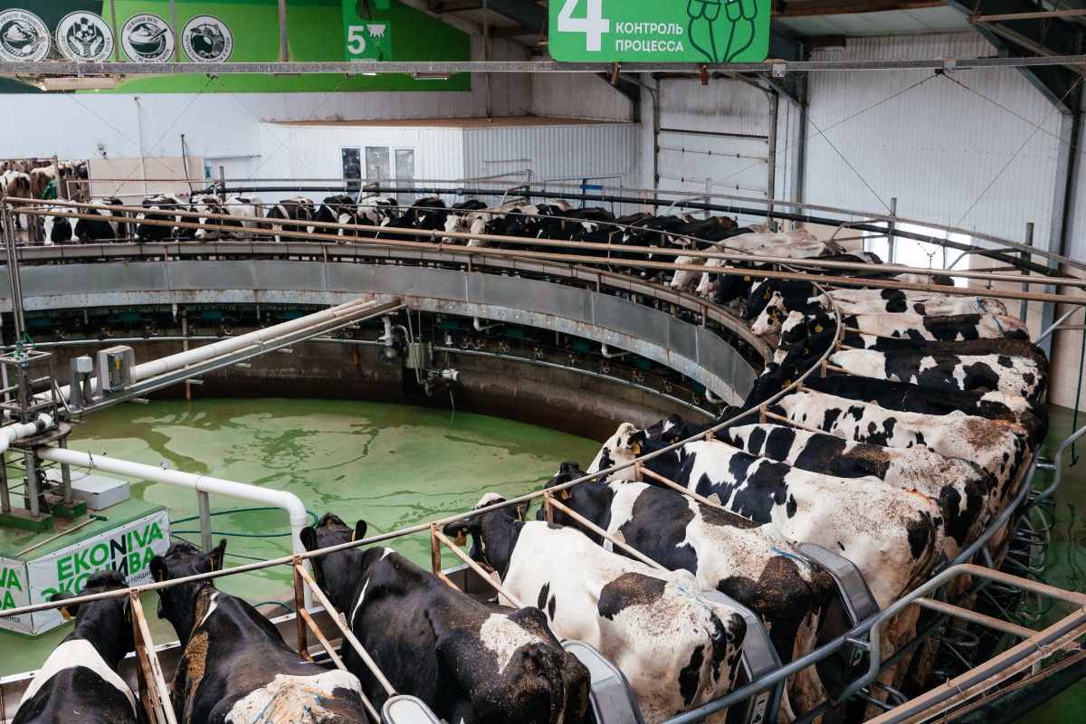 Доение на «ЭкоНиве» происходит на установке «карусель»: коровы заходят в стойло и вращаются по кругу. За один цикл, длительностью 8-10 минут, доение завершается, и бурёнки задним ходом покидают «аттракцион». Они понимают, что ограждение установки сзади закончилось, значит, пора шагать назад.