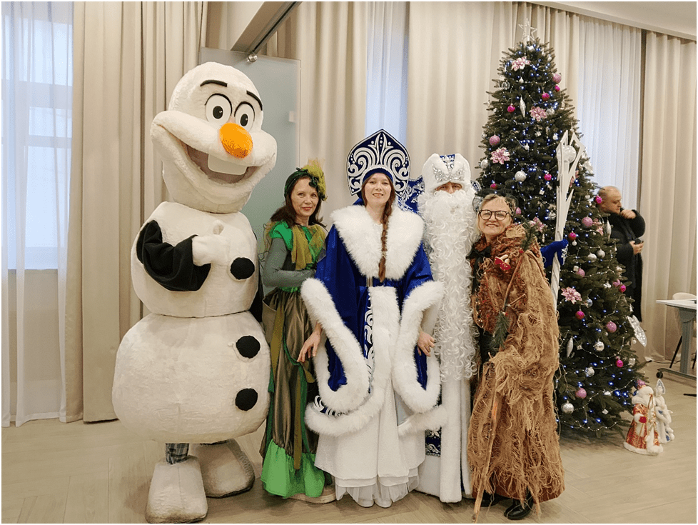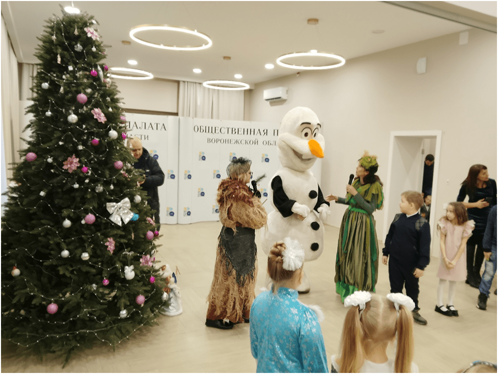 Огромный конференц-зал, где обычно проходят серьёзные обсуждения и рабочие встречи, превратился в пространство с роскошной зеленой красавицей в гирляндах, где происходит сказочное действо, а дед Мороз и Снегурочка дарят подарки своим юным гостям. Главными новогодними персонажами, как и их помощниками — кикиморами, Снеговиками, бабками-ежками — стали на время члены Общественной палаты. Они не только проявили актёрские таланты, но и написали сценарий, нашли костюмы и с удовольствием погрузились в новые образы, составив достойную конкуренцию профессиональным артистам, работающим на детских праздниках.