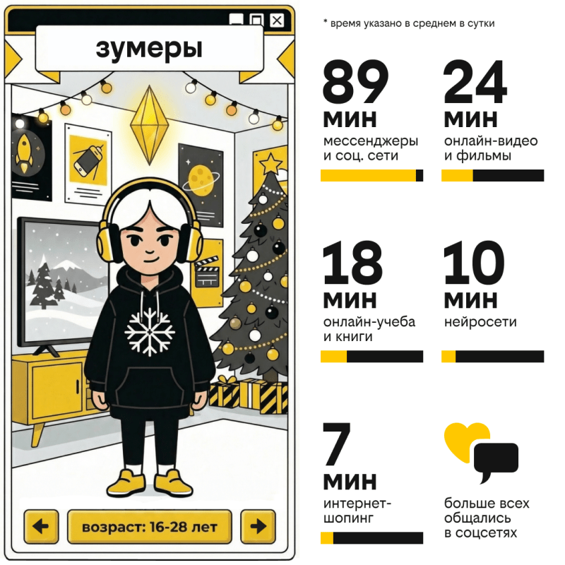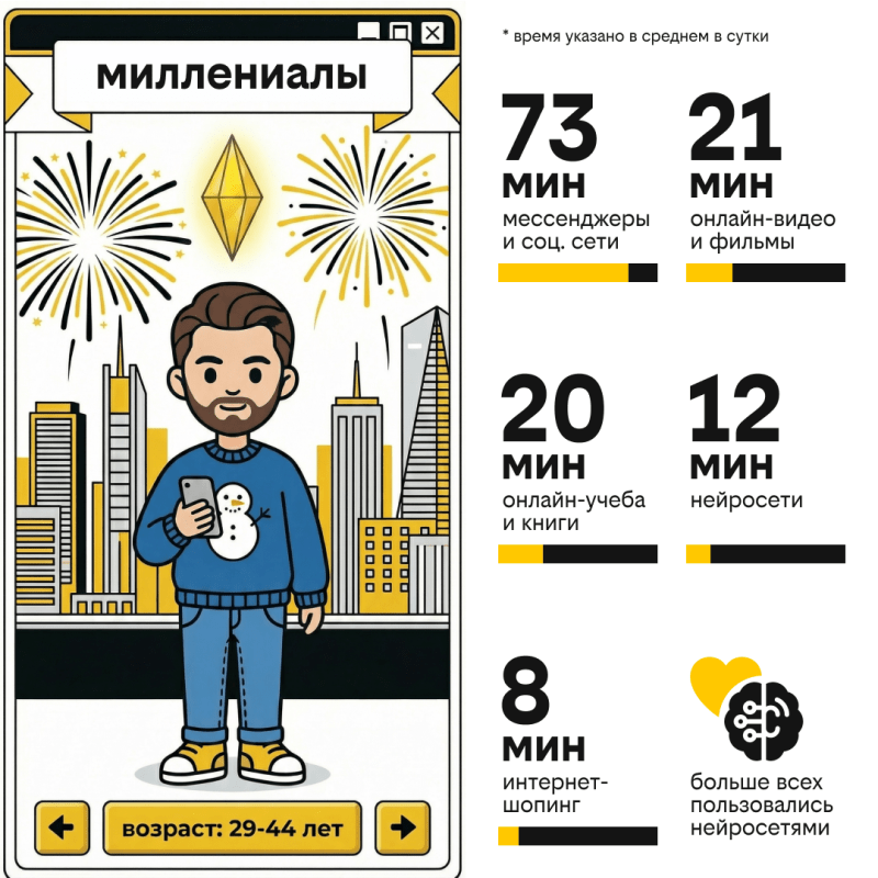 Зумеры (молодые люди до 28 лет) чаще остальных смотрели видео и общались в соцсетях – на это уходило около полутора часов. Миллениалы, более старшее поколение, которым сейчас примерно до 44 лет, чаще остальных пользовались нейросетями (около 12 минут в день).