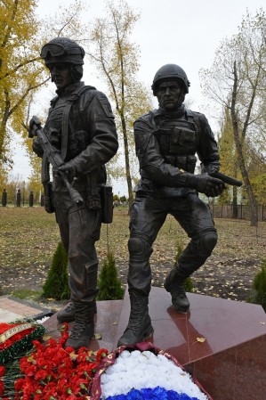 Памятник – две фигуры из бронзы. Это собирательный образ двух бойцов - современного спецназовца и ветерана 1990-х годов. Автор монумента - скульптор-монументалист, член Союза художников России Владимир Петрихин.