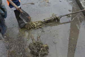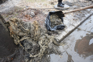Пока корреспонденты «Ё!» разбирались в жалобе жителей частного сектора, на место аварии приехали сотрудники «Росводоканал Воронеж». Справедливости ради отметим, что засоры канализации объёмные: несколько метров тряпок, бинтов, салфеток и гигиенических средств, всё это почти три часа доставали из колодца рабочие…