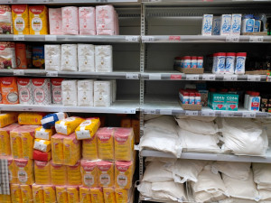 Суббота, 5 февраля, день рабочий. Возможно, поэтому людей в торговом зале было крайне немного. На полках с некоторыми товарами со вчерашнего дня появились красные таблички — те самые, которые информируют о приобретении того или иного товара в определённом количестве. Такие таблички мы увидели возле полок с мукой, сахаром, подсолнечным маслом и крупами.