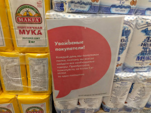 Текст этих табличек нацелен на то, чтобы успокоить людей: «Уважаемые покупатели! Каждый день мы пополняем полки, поэтому вы всегда найдёте все необходимые товары». И далее — просьба приобретать товары, но в размере не более: