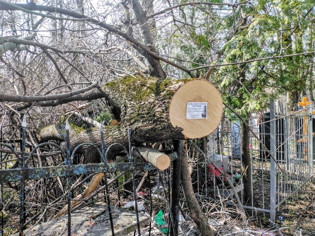 Упавшее дерево рабочие распилили на несколько частей. Все они теперь лежат прямо на могилах. На спиленных деревьях кто-то уже успел расклеить рекламные проспекты с предложением коммерческих услуг по благоустройству захоронений.
