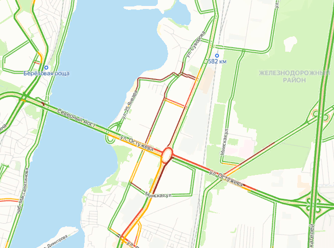 Практически полностью остановилось движение на подъезде к Северному мосту. Заторы образовались на Ленинском проспекте, улицах Добролюбова, Перевёрткина, Остужева.