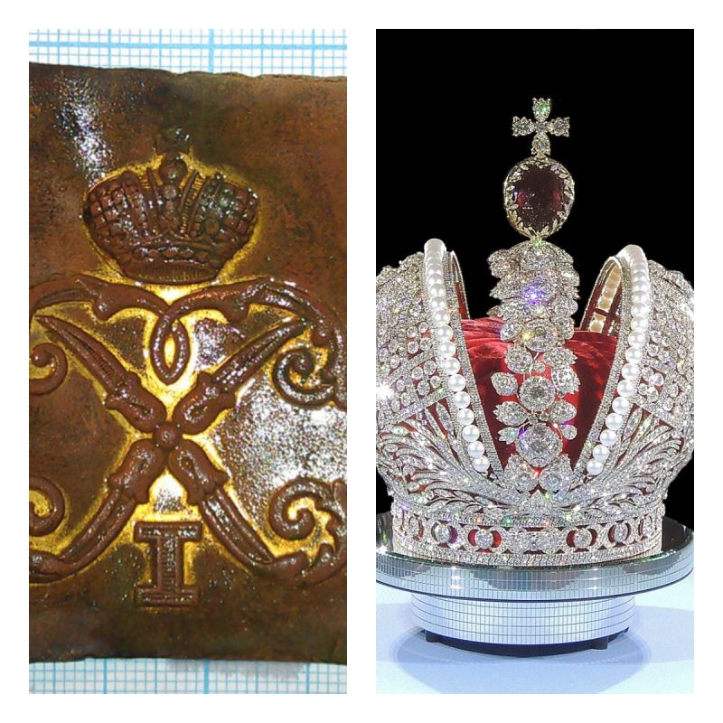 Со временем к вензелю добавилась ещё и корона. В какой именно момент она туда присоединилась, сказать трудно. Любопытно, что при Петре I этой короны в природе вообще не существовало, её изображения рядом с вензелем быть не могло. Её изготовили только в 1762 году для коронации Екатерины II.