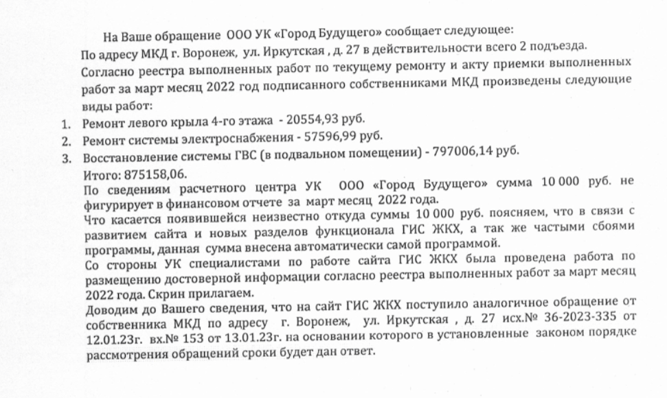 В обслуживающей дом № 27 управляющей компании «Город Будущего» в ответ за запрос «МОЁ! Online» заявили, что на самом деле никакого ремонта в загадочном четвёртом подъезде, конечно же, не проводилось — данные в ГИС ЖКХ не соответствовали действительности. Коммунальщики также пояснили, на что на самом деле пошли деньги.
