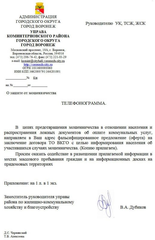 Читательница «МОЁ!» прислала в редакцию уведомление управы Коминтерновского района, которая решила предупредить жильцов о том, как выглядят поддельные квитанции на оплату услуг ЖКХ. Чиновники подтвердили, что действительно распространяли эту информацию.
