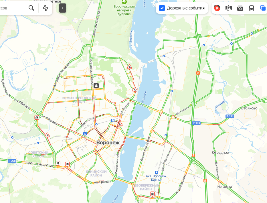 9-балльные пробки парализовали дороги в Воронеже около 17:30 сегодня, 14 апреля. Информация об этом появилась на «Яндекс. Картах».