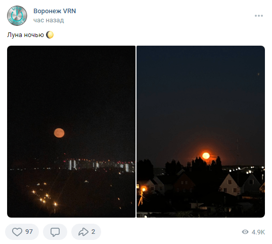 Необычное полнолуние было в Воронеже в ночь с 4 на 5 июня. Луна оказалась цвета клубники из домашнего варенья — горожане сфотографировали её и опубликовали снимки в соцсетях.