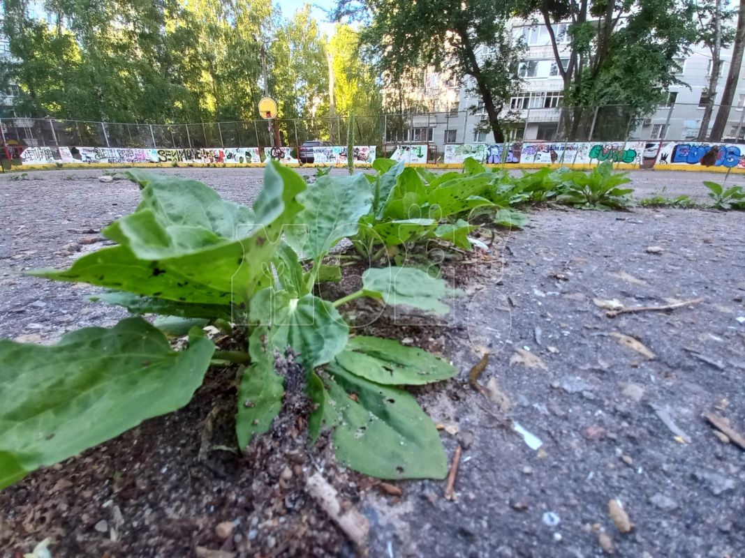 Народный корреспондент называет коробку для футбола/хоккея одной из самых страшных в Воронеже. И показывает на фото, что в ограждении выбито большинство секций, а на оставшихся — граффити на английском, в центре, под ногами потенциальных спортсменов — подорожник.