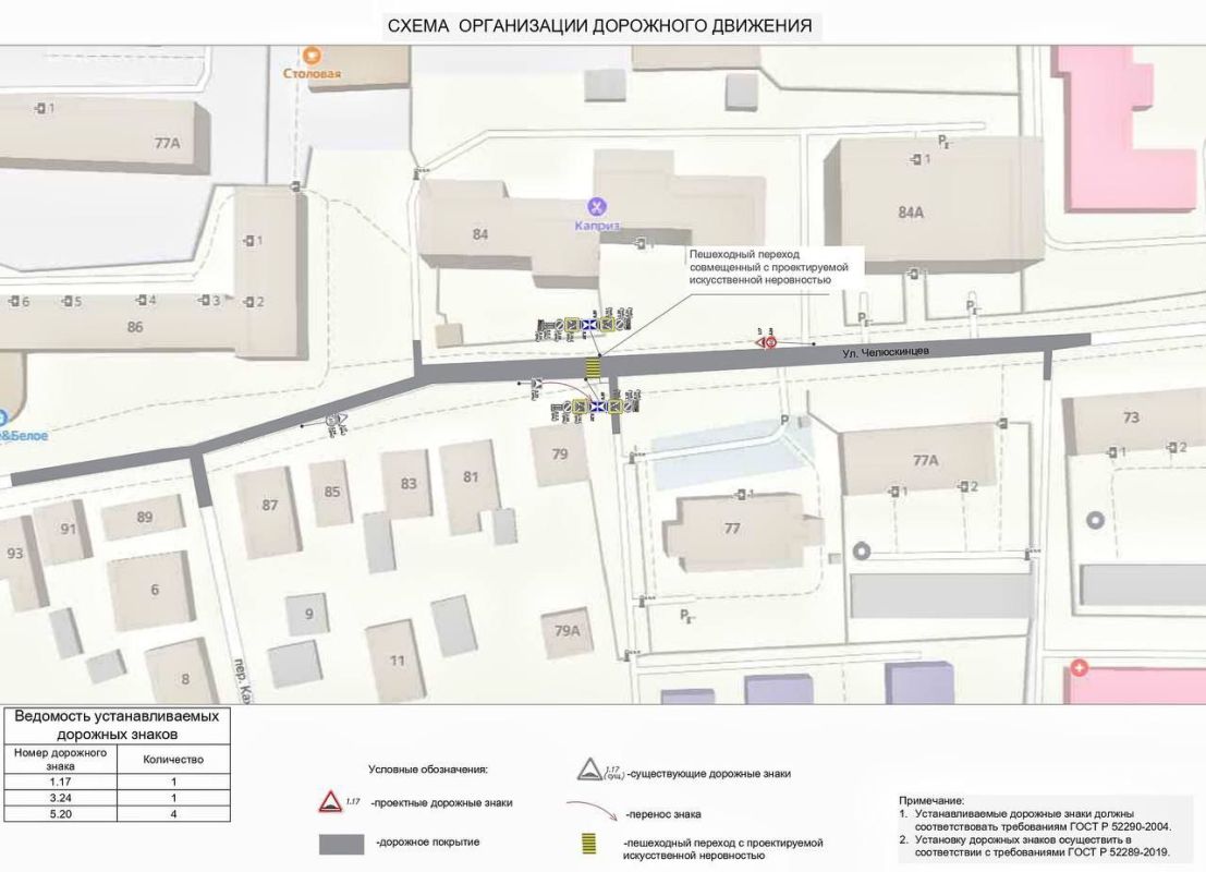 В районе дома 84 по улице Челюскинцев в Ленинском районе города появится сразу два новых знака: «Ограничение максимальной скорости» и «Искусственная неровность».