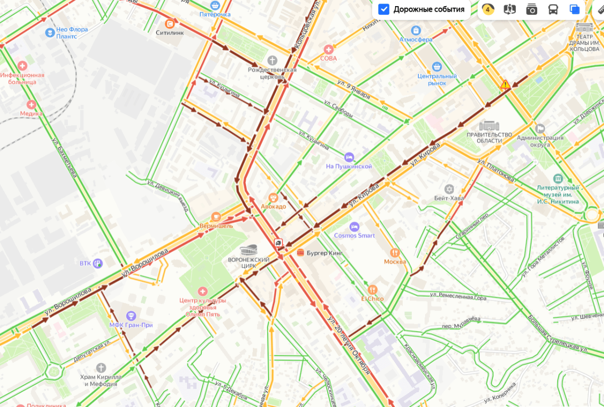 Судя по данным «Яндекс.Карт» движение сильно затруднено на улицах Кирова, Моисеева, Ворошилова, Кольцовской, Свободы и Красноармейской.
