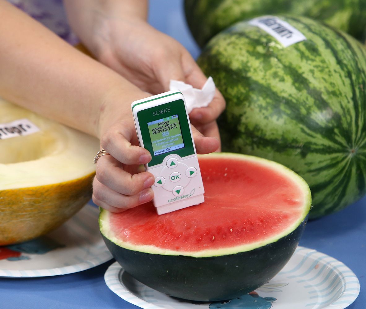 Однако есть и так называемая агрессивная агротехника, когда бахчеводы сознательно буквально заливают растения удобрениями с нитратами. На минувшей неделе с помощью редакционного нитратомера мы решили выяснить, применяется ли такая техника при выращивании арбузов и дынь. Мы измерили уровень содержания нитратов в трёх образцах арбузов и дынь из крупных торговых сетей, а также в арбузе и дыне, которые приобрели на развале. Так как нитраты распределяются в плодах не равномерно, а послойно, в каждом образце мы проводили измерения у корочки, в мякоти и в сердцевине.