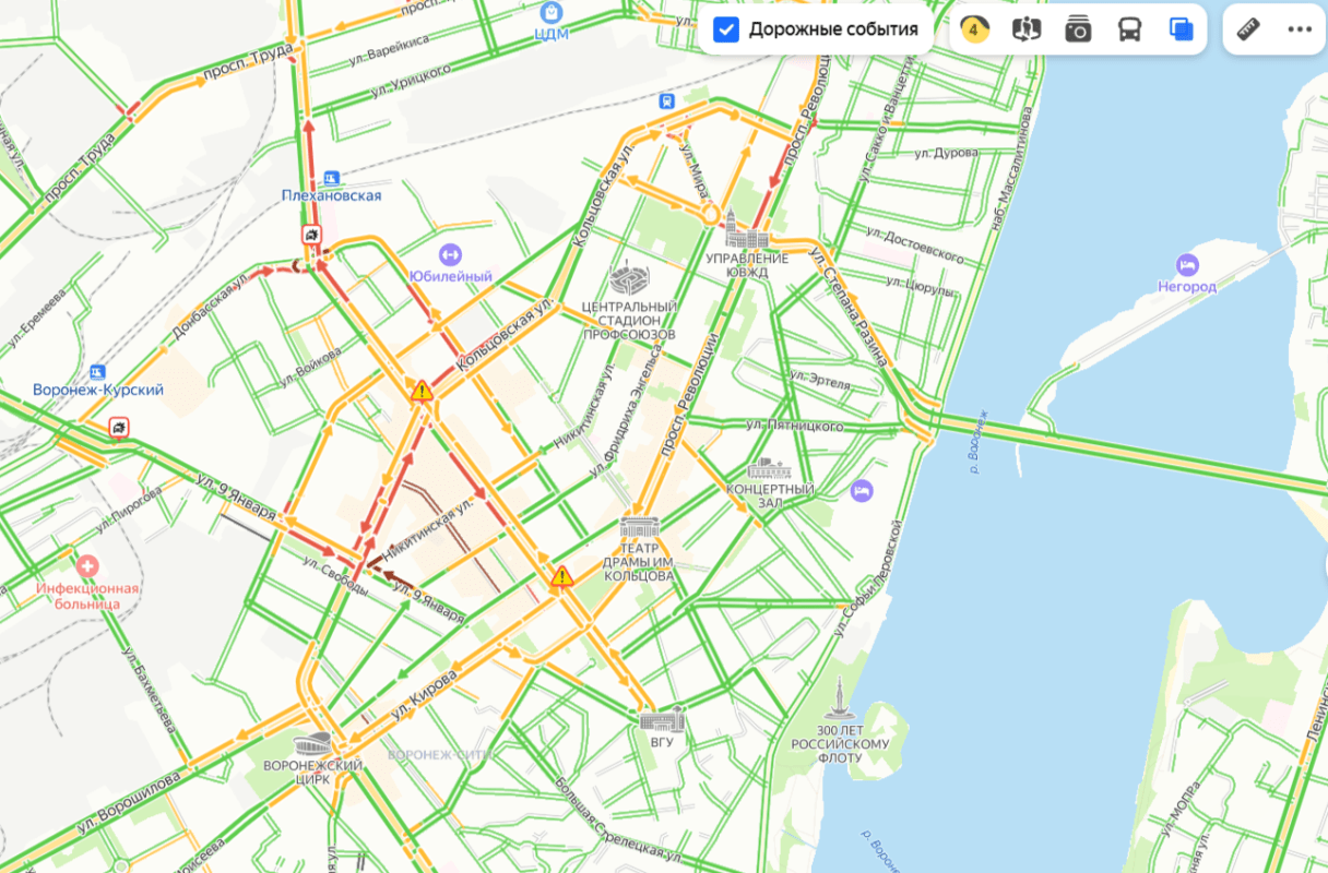 Пробки парализовали движение в центре Воронежа днём субботы, 21 декабря, если верить данным сервиса «Яндекс карты».