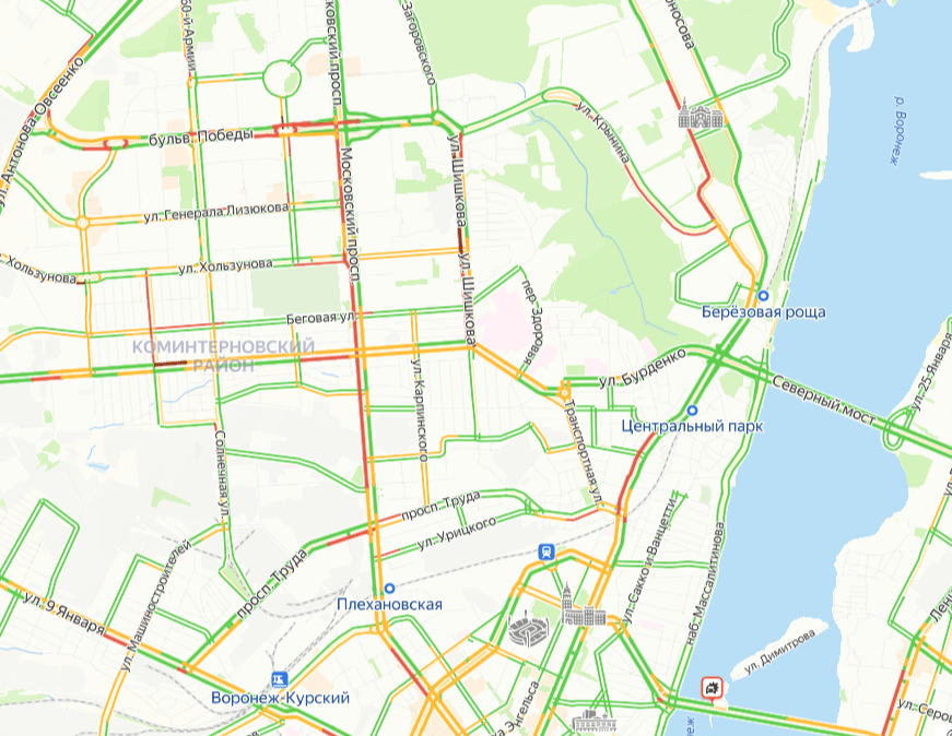 Затор скопился в сторону центра города. Серьёзные заторы также на улицах Шишкова и 9 Января. А вот на левом берегу дородная обстановка куда лучше — там дороги практически свободны. На Чернавском мосту в сторону правого берега произошло ДТП, образуется небольшая пробка.