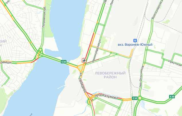 Пробка скопилась на левом берегу перед ВоГРЭСовским мостом в Воронеже, если верить «Яндекс. Картам».