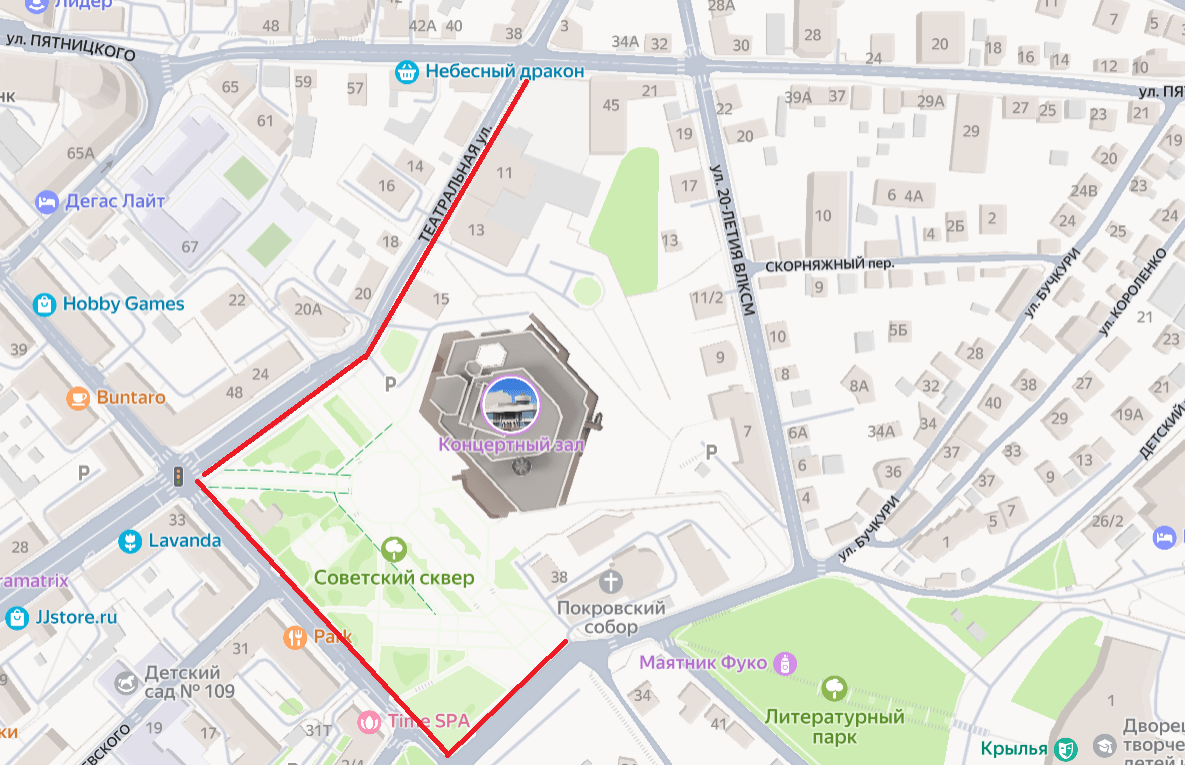 - Театральной (от улицы Пятницкого до улицы 25 Октября – по стороне Советского сквера);