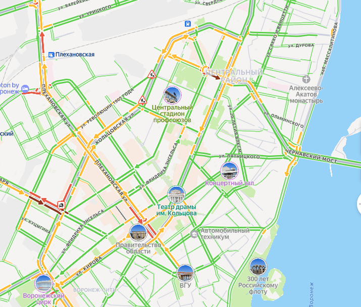 На онлайн-картах видно, что заторы скопились на улицах Плехановской, Кольцовской, Кирова, 9 Января. По словам автомобилистов, в реальности обстановка ещё хуже, чем отмечено на картах.