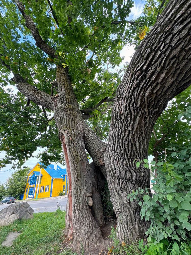 Следующая точка нашего путешествия — Рамонский район, территория Станции юных натуралистов. Здесь нас встречает истинный красавец-долгожитель, чей возраст — 351 год — официально признан. Этот черешчатый дуб является памятником природы регионального значения и внесен в Национальный реестр старовозрастных деревьев России. Он — последний из могикан, живой остаток некогда могучей Нагорной дубравы.