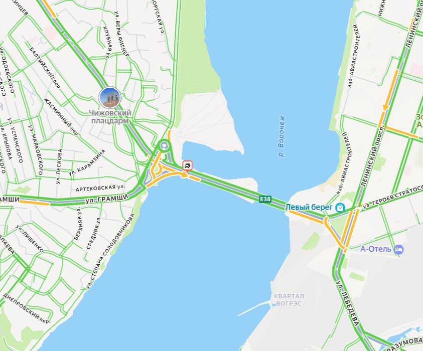 По данным Яндекс карт, на мосту произошло ДТП. Оно перекрывает левый ряд движения.