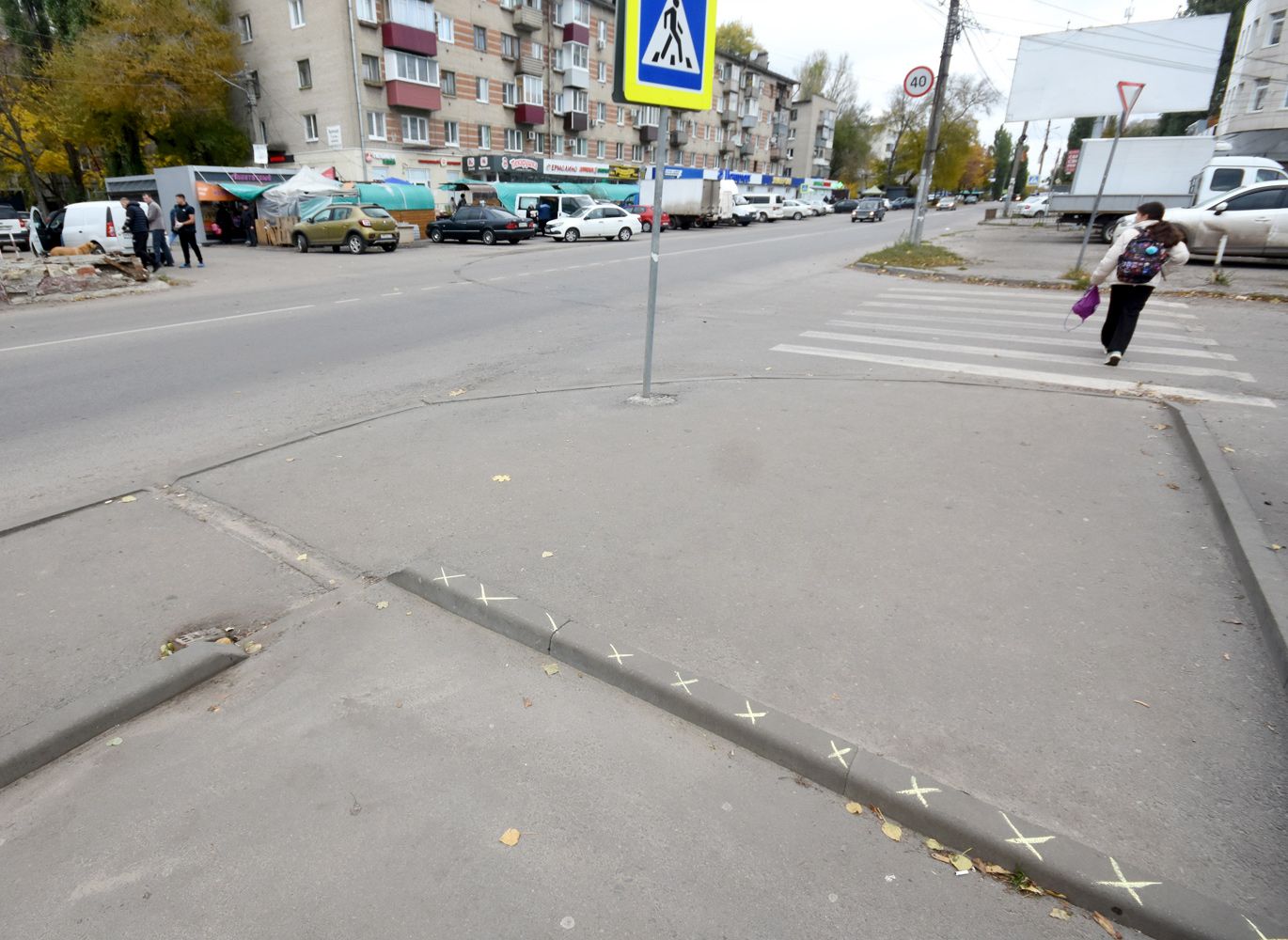 Торговца рыбой Виктора, помогающего здесь прохожим, мы на прошлой неделе не застали, зато прихватили с собой цветные мелки. И Татьяна сама нанесла несколько жёлтых крестиков на опасную, длиной в полтора метра, часть этого бордюра. Так он хотя бы стал виден. Правда — до первого дождя.