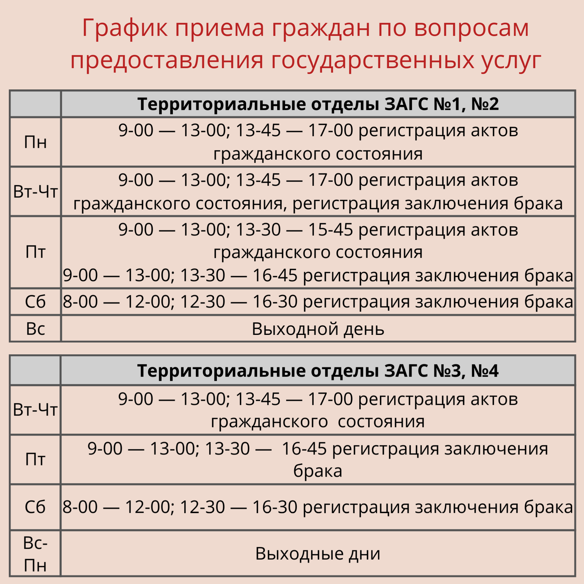 Отмечается, что задачи и функции отделов остаются прежними. Однако с 7 ноября территориальные отделы ЗАГС № 1 и № 2 переходят на шестидневный режим работы — с понедельника по субботу. В понедельник граждан будут принимать с 9:00 до 17:00 с перерывом 13:00 — 13:45.