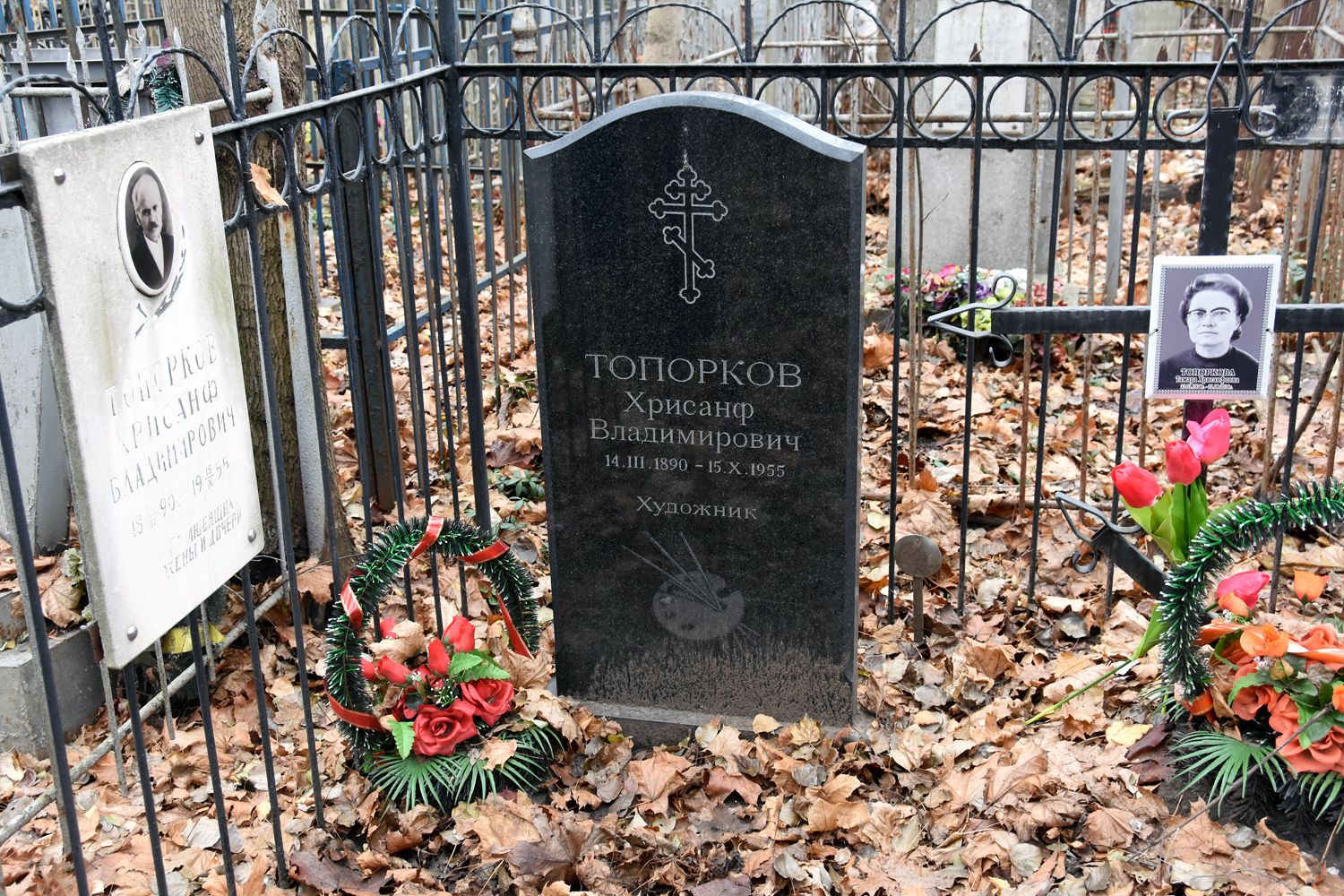 — Вот могила художника Хрисанфа Топоркова (1890 — 1955), ученика знаменитого воронежского живописца Александра Бучкури. Топорков был участником Первой мировой войны, младшим унтер-офицером. Попал в плен в июле 1916 года под Тернополем. В годы СССР работал художником на Отроженском вагоноремонтном заводе и на заводе имени Дзержинского. В 1943 — 1945 годах занимался выпуском плакатов «Окна ТАСС», восстановлением росписей Никольской церкви, писал иконы для Казанской церкви в Отрожке, — говорит краевед.