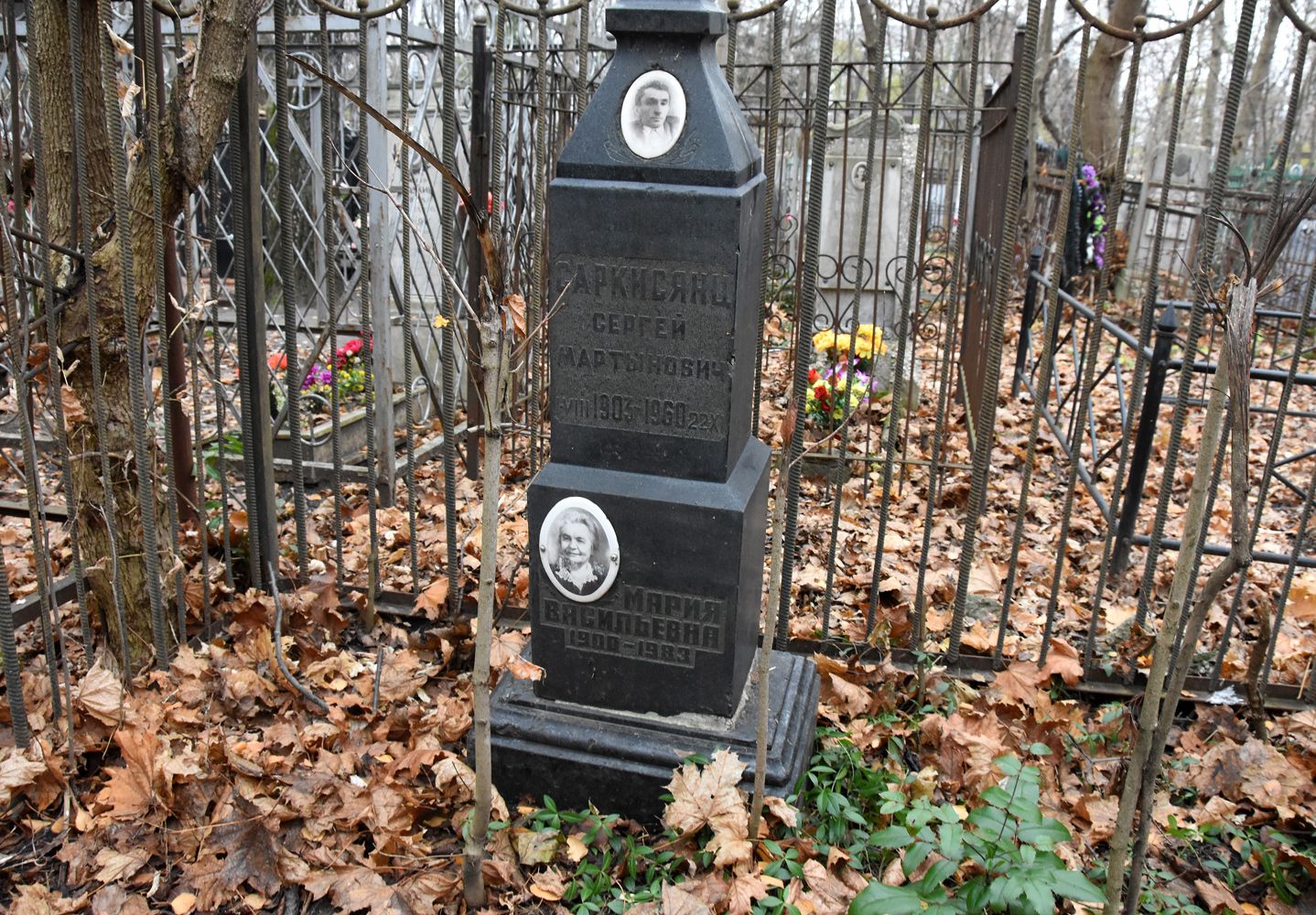 Примерно такая же история на могиле Сергея Саркисяна (1903 — 1960) и его супруги Марии Васильевны (1900 — 1983). Тут старинный памятник, и если посмотреть сбоку, то на уровне земли можно увидеть клеймо мастера, который его изготавливал ещё до революции. Там написано: «Коляскин. Воронеж».