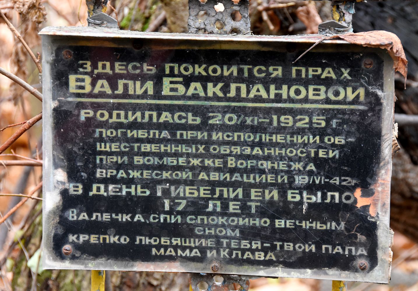 Военную тему мы продолжили в другой части кладбища — ближе к улице Хользунова. Вот могила Вали Баклановой, родившейся в 1925-м. Погибла в 17 лет — как написано на надгробии, «при исполнении общественных обязанностей при бомбёжке Воронежа вражеской авиацией» 19 июня 1942 года.