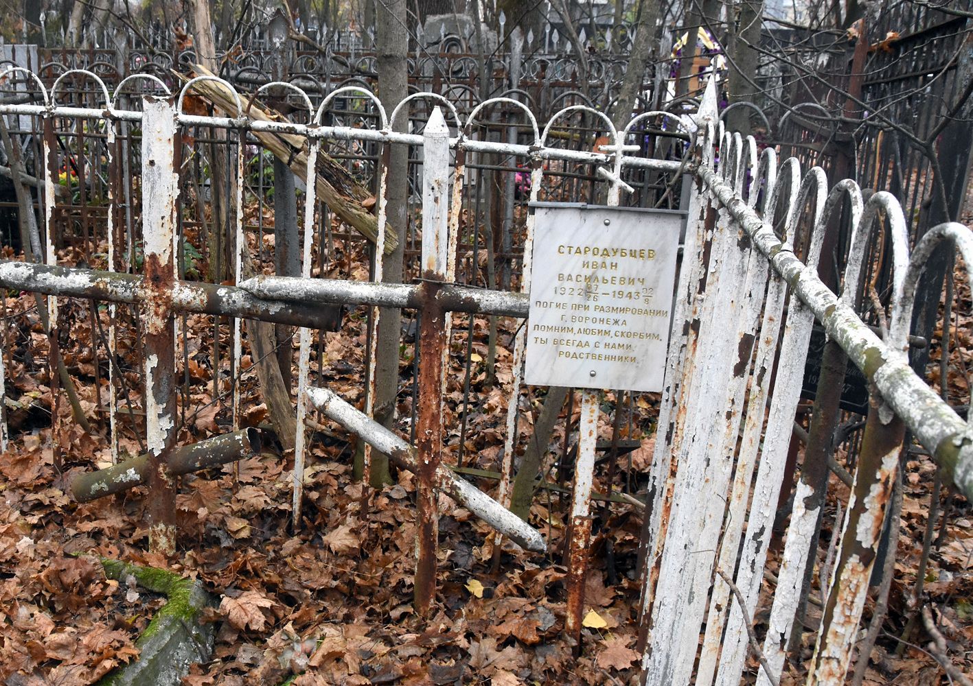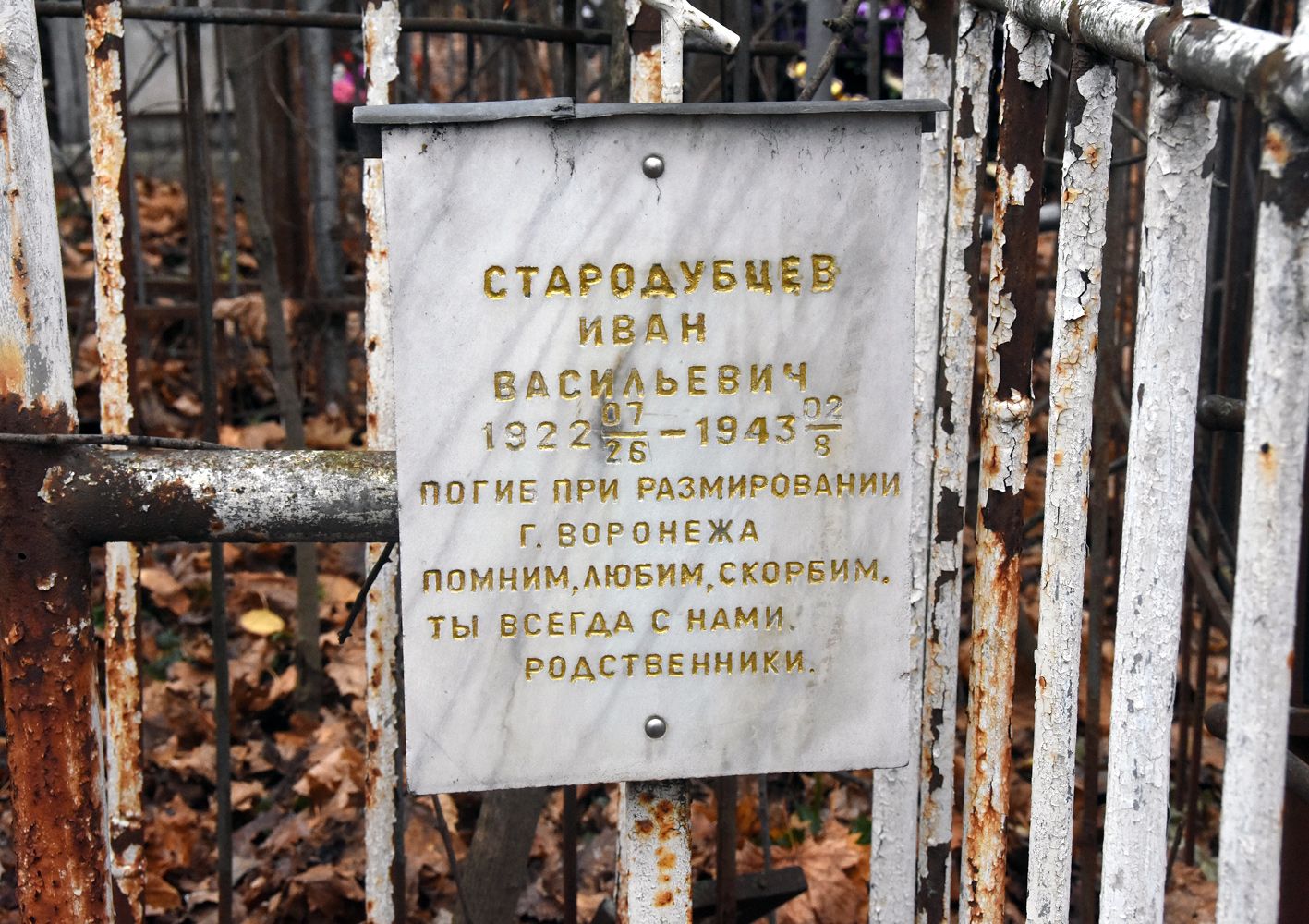 — Может быть, она тушила зажигательные бомбы или помогала раненым, разбирала завалы. Из 14 — 17-летних ребят, тех, кому было рано идти на фронт, в разных городах составлялись бригады, помогавшие в опасных ситуациях. Это, скорее всего, единственное во всём Воронеже подобное захоронение — 17-летней девчонке, погибшей, спасая других. Сейчас могила заброшена, постараемся привести её в порядок. А ближе к центральному входу — могила 21-летнего Ивана Стародубцева, погибшего при разминировании уже освобождённого Воронежа летом 1943 года,— показывает Евгений.