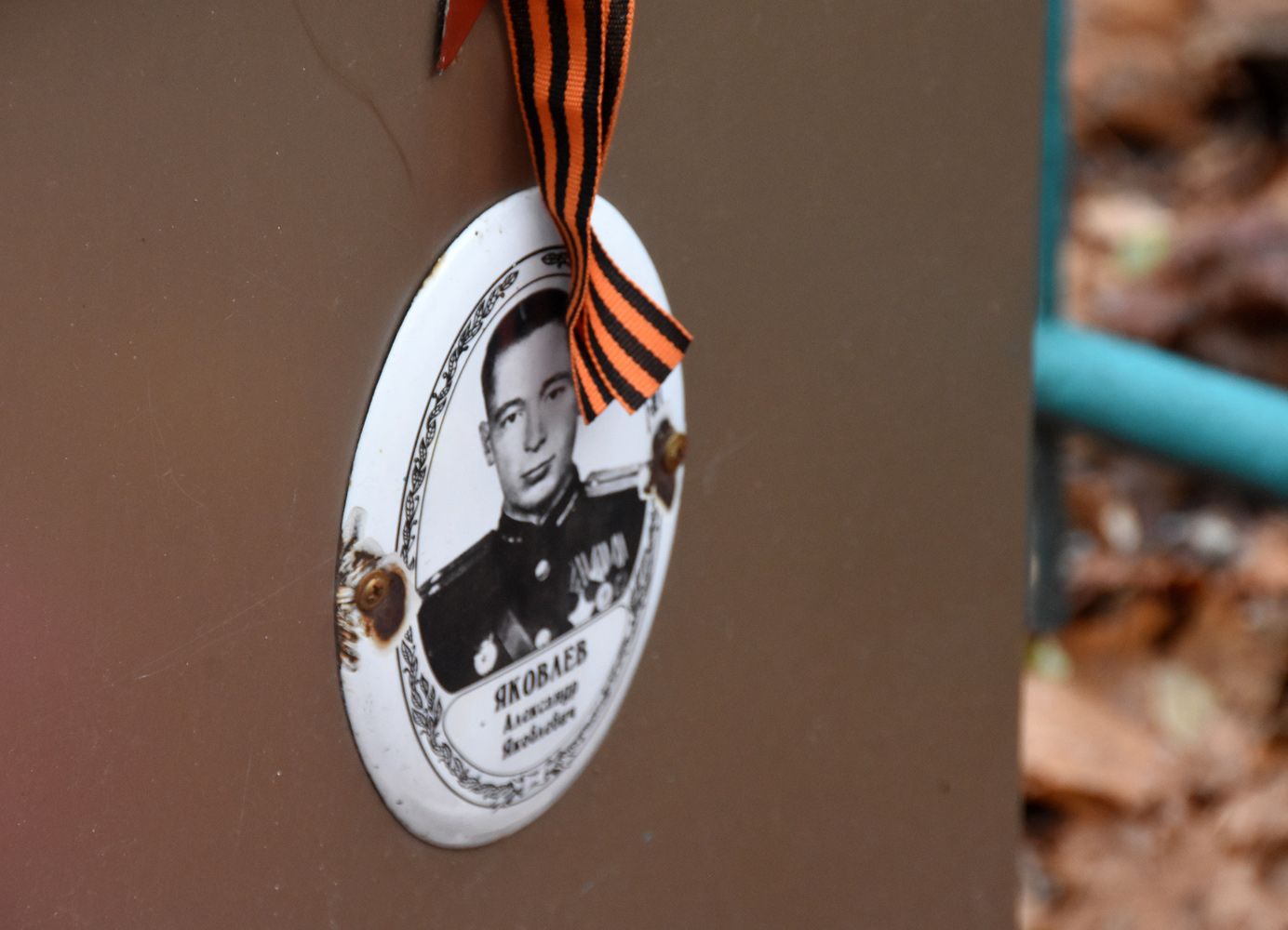На одной из могил, к которой было непросто подобраться, — свежее красное знамя, которое, очевидно, поставили родственники в канун 9 мая 2025 года. Но чтобы попасть за ограду, надо наклониться — верхняя планка входа находится в метре от земли. Здесь похоронен Александр Яковлев — участник войны, который и при жизни заслужил такие поклоны...