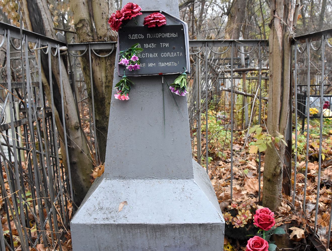 А в сотне метрах от знамени — безымянная братская могила, где, судя по табличке, похоронены трое бойцов Красной армии.
