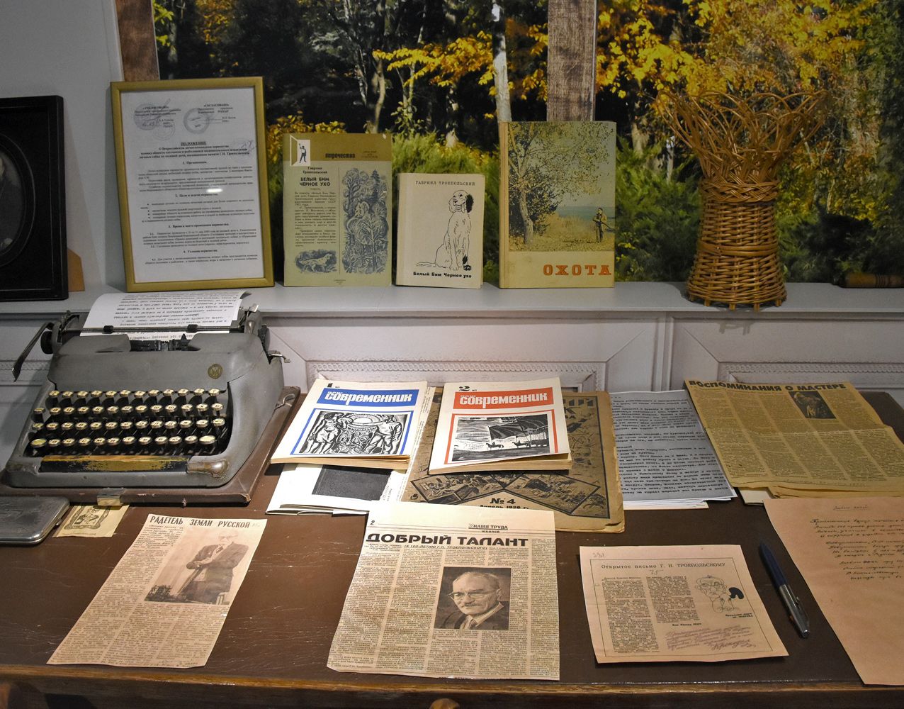 Корреспонденты «МОЁ!» перед началом праздника поднялись на второй этаж и осмотрели небольшую музейную экспозицию: афиши, плакаты, фотографии, несколько изданий «Белого Бима» — отовсюду на нас смотрели разные сеттеры. Их было гораздо больше, чем портретов автора знаменитой повести, экранизированной в 1977 году Станиславом Ростоцким и переведённой более чем на 20 языков мира. Гавриил Троепольский при жизни был скромным и совсем не пафосным человеком.