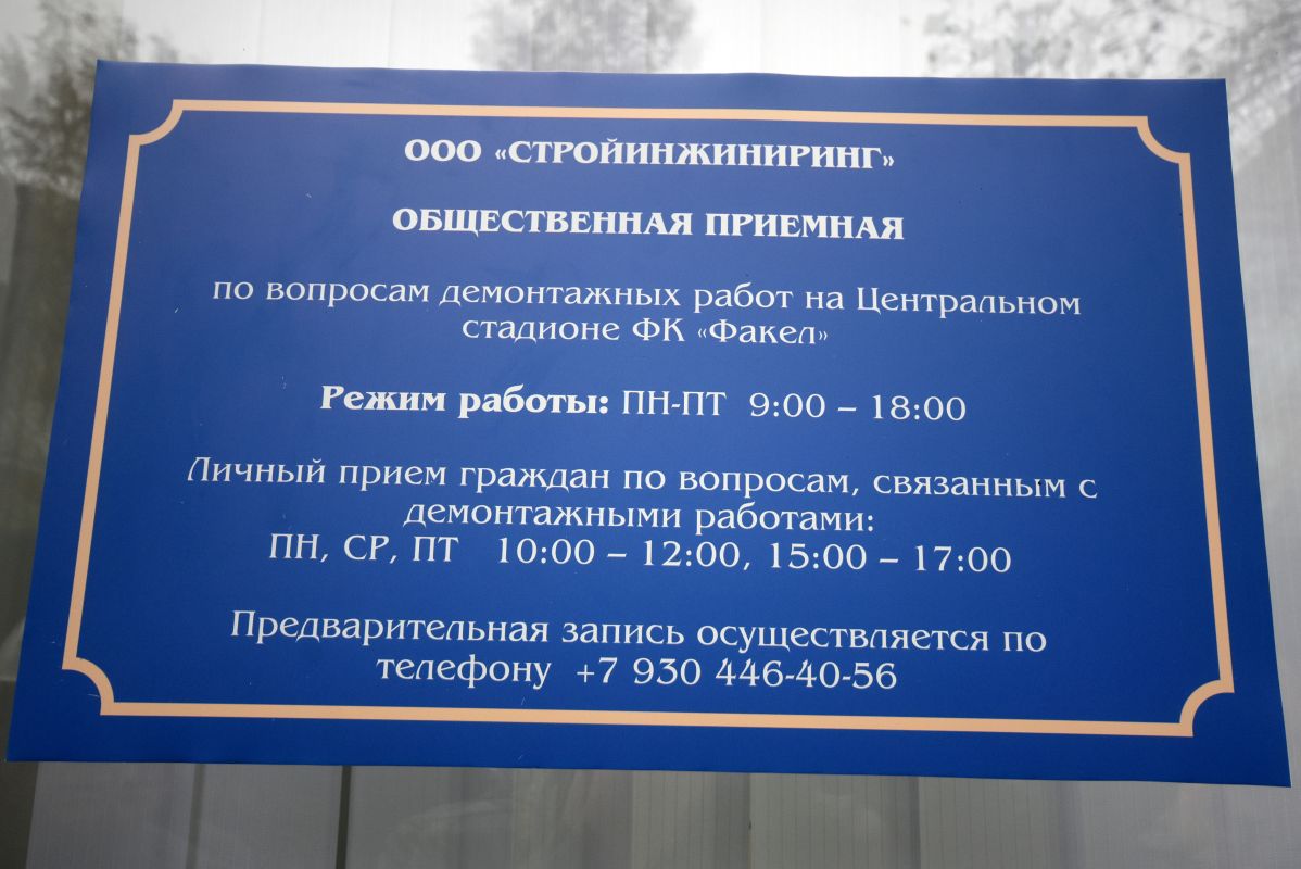 Для оперативного ответа на вопросы жителей соседних домов по ходу демонтажа стадиона создана общественная приёмная, которая будет работать ежедневно в районе бывших билетных касс на улице Студенческой ближе к Комиссаржевской.