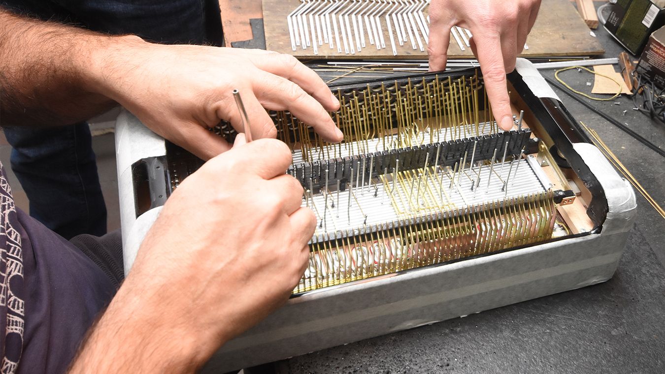 В соседнем цехе — маленькой комнатке — царит большой человек Павел. Колоритный бородач — типичный андеграундный музыкант. Он 30 лет на этом месте. По образованию музыкант, играет на гитаре и фортепиано. Здесь занимается настройкой. Причём делает это с помощью напильника, подтачивая голова.