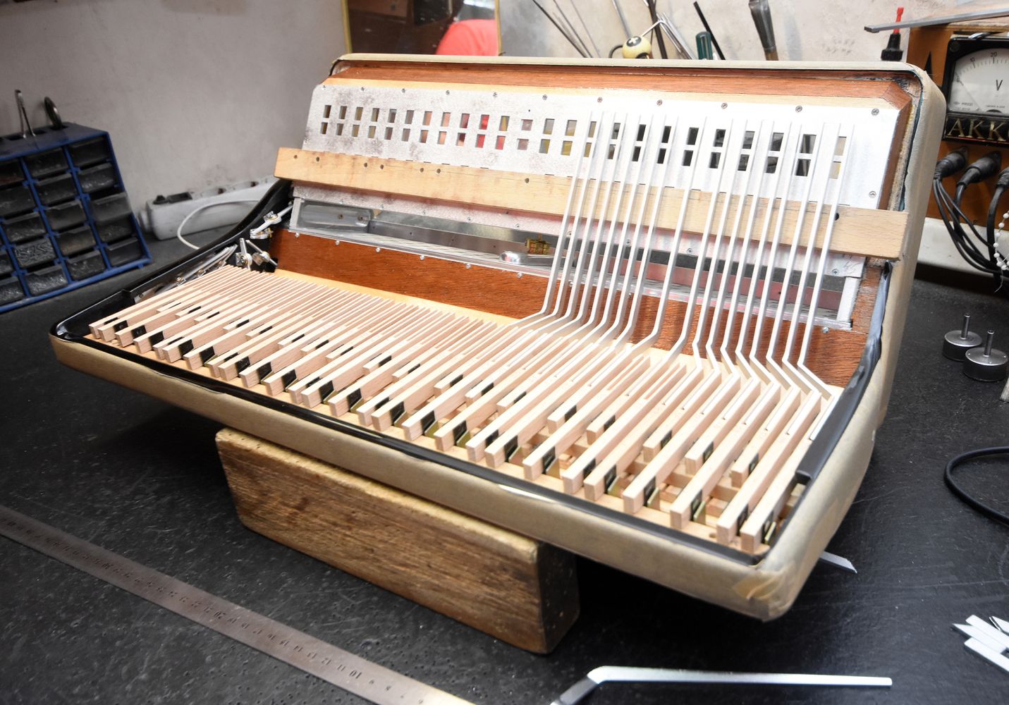 — Правая механика, левая механика, внутри установлены резонаторы, планки, меха — мы это всё собираем. Потом покрываем лаком, навешиваем планки, сверлим, устанавливаем ремни,— рассказывает о своей части работы мастер Владимир.