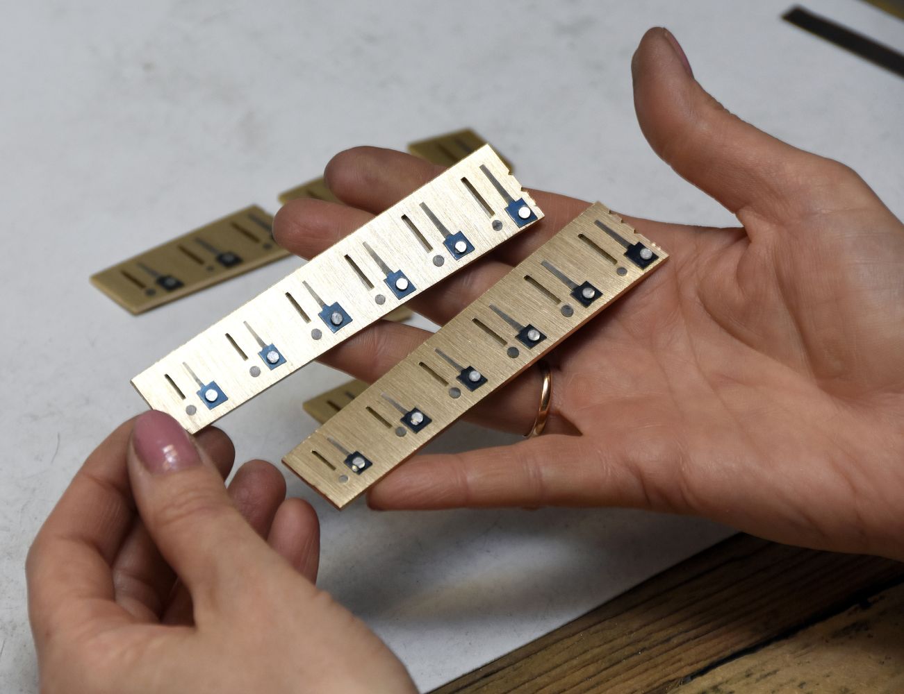 — Голос большой, чтобы его утяжелить, делаем напайки из латуни, — объясняет слесарь Владимир. — Когда он готов, ставим его на место, клепаем. Готовую планочку отдаём на дальнейшую сборку. Настройщики уже непосредственно в баяне настраивают звук.