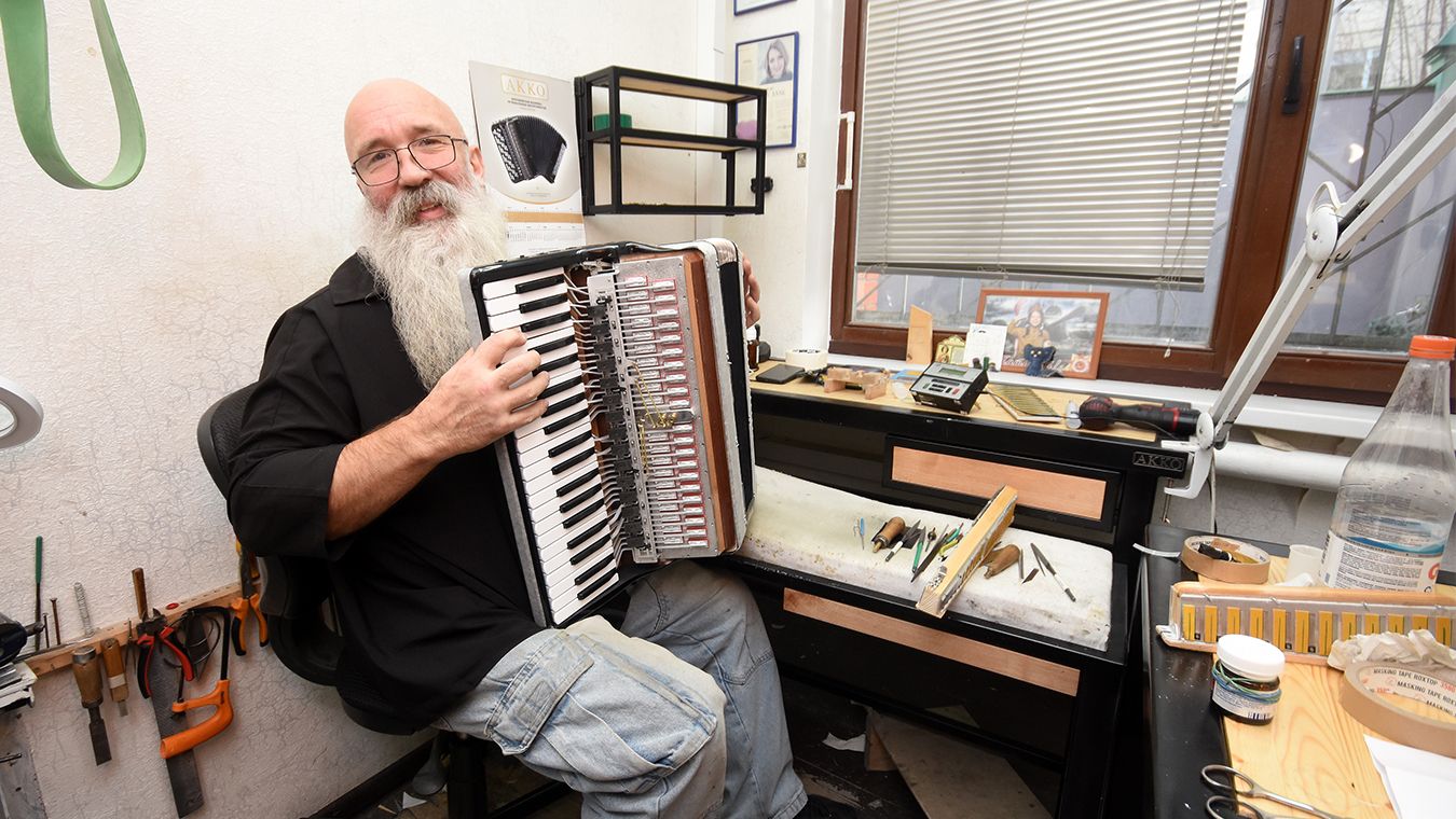 Окончательный этап — обыгрывать инструмент. Этим занимается баянист по образованию и настройщик баянов по призванию Юрий Чемерис. Он тоже один из старейших работников фабрики и ученик её основателя — Владимира Авралёва.