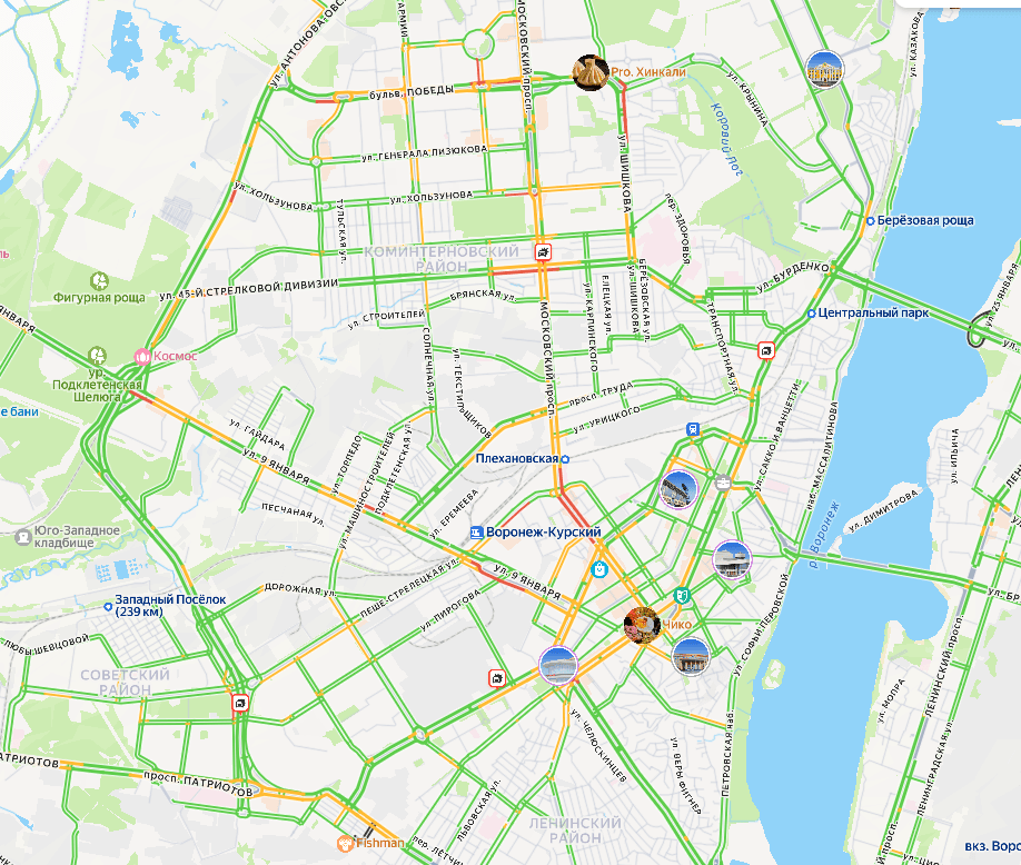 Местные жители жалуются на заторы в разных частях города, в том числе в центре: на Кольцовской, Плехановской, 20-летия Октября, проспекте Революции, Кирова, а также на левом берегу на Ленинском проспекте.