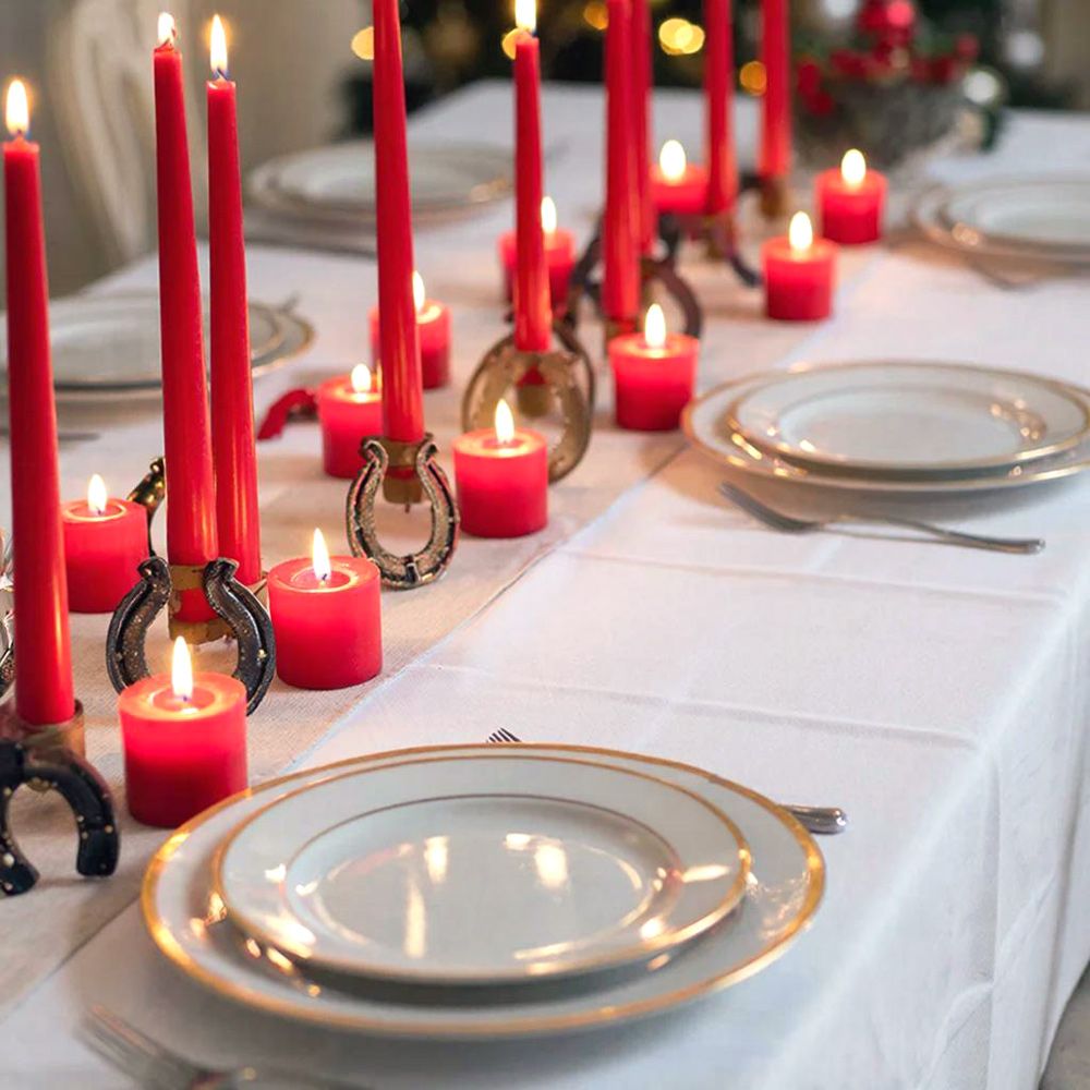 Обязательный атрибут праздничного стола — свечи. Расставьте несколько высоких и красных свечей и россыпь маленьких и золотистых, чтобы создать огненную атмосферу.