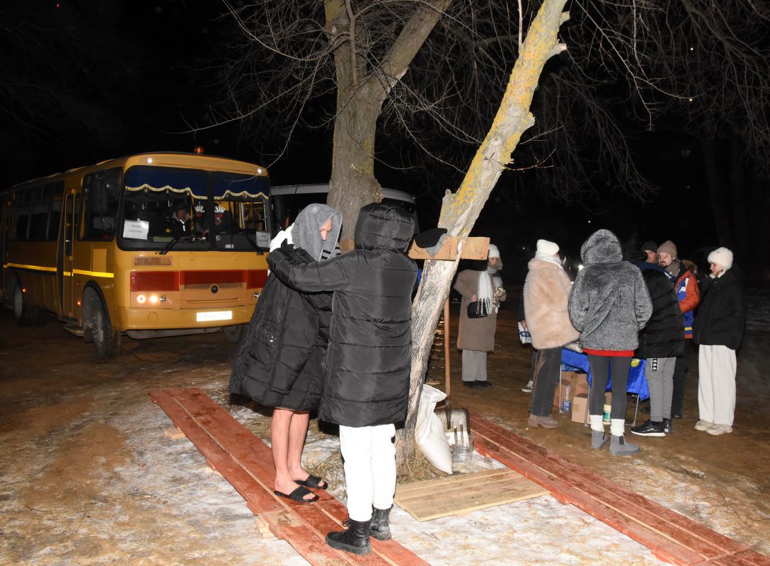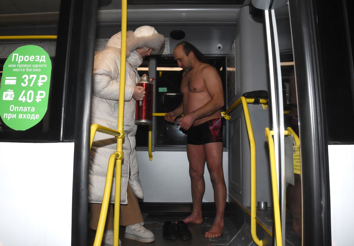Ближе к полуночи народа возле купели, рядом с которой встречали новый день корреспонденты «МОЁ!», чуть прибавилось. Правда, на этот раз на берегу не было разбито традиционных палаток для обогрева и переодевания — с маршрутов сняли два 35-х автобуса, в салонах которых люди переодевались (для мужчин и женщин маршрутки были разные) и шли к ледяной воде...