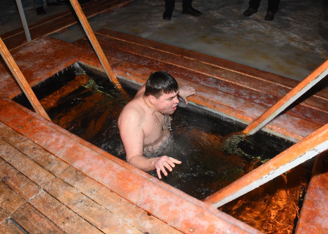 Сотрудники управы Левобережного района громко подсчитывали каждого рискнувшего купаться в 16-градусный мороз, а число стоявших на берегу силовиков — росгвардейцев и полицейских — заметно превосходило количество купальщиков...