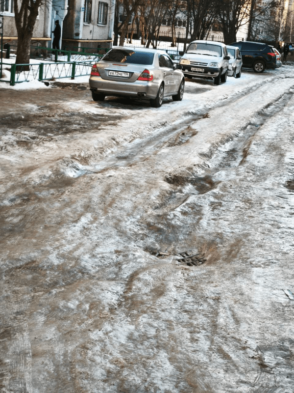 По словам горожан, глубокая колея и сплошной лёд превратили придомовую территорию в «зону повышенной опасности»