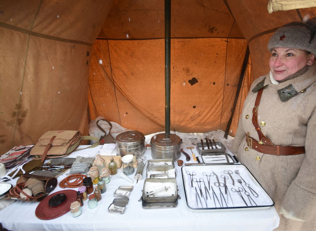— Перед вами — медицинский сортировочный пункт. Такие находились на расстоянии 1,5 - 3 км от линии фронта и принимали раненых, которым оказывалась первая помощь. Ко мне, например, принесли раненого, я должна как врач понять, насколько тяжела его рана. Срезаю садовым ножом его одежду и определяю серьёзность ранения. Бывало, что приходилось оперировать в таких палаточках, случалось — отправляли бойца в тыл в госпиталь.