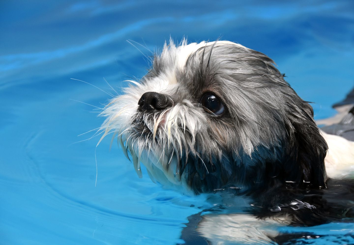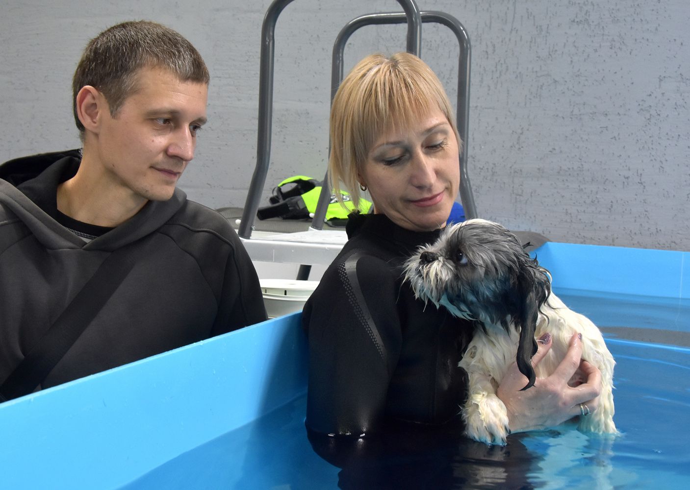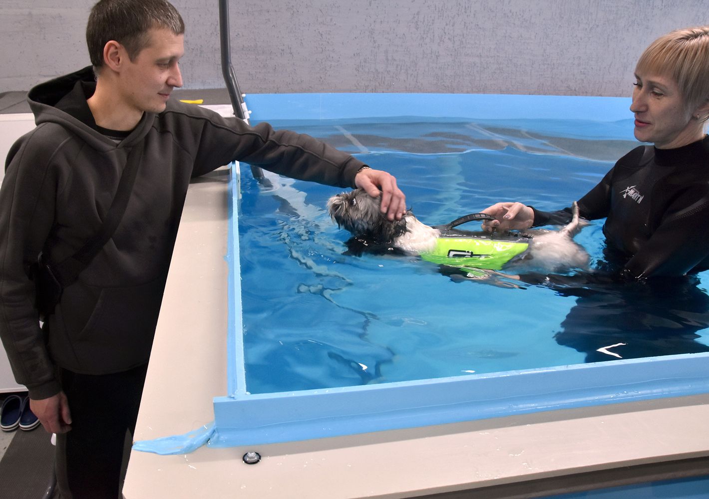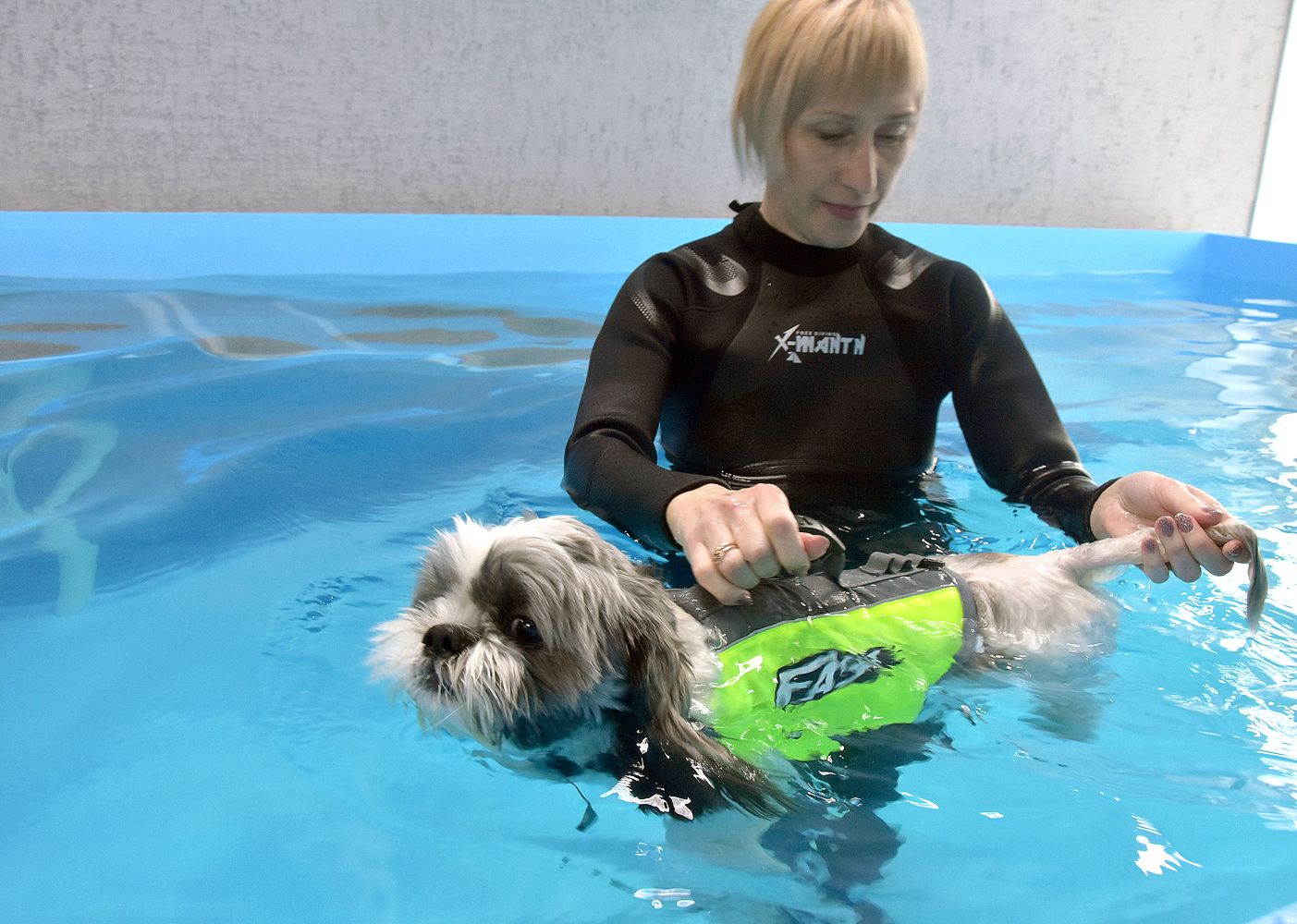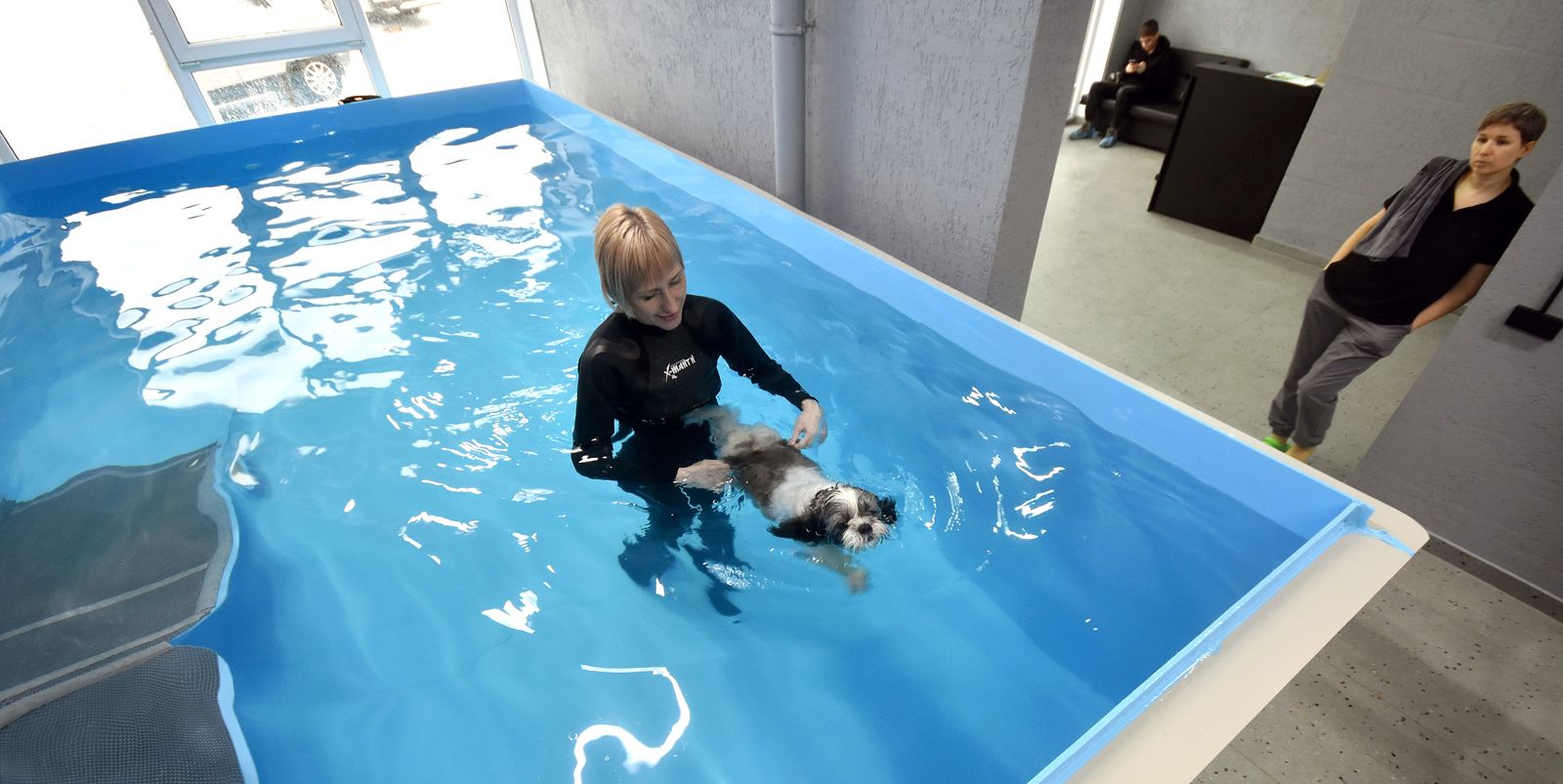 Здесь всё как в обычном бассейне: перед заплывом — душ. Посетитель по кличке Значок — собака породы ши-тцу. Сегодняшний поход на акватренировку — это его дебют. К водным процедурам пёс относится с подозрением. Но выносит их стоически — закалили регулярные походы к грумеру, где ему по три часа наводят красоту. Здесь он надеялся, что намыливанием всё и обойдётся. Но после шампуня водрузили на него жилет и плюхнули в воду.
