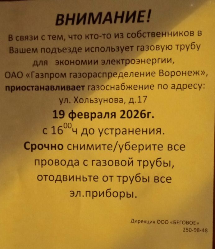 Объявление об отключении повесила местная УК. Причиной якобы стали электропровода для экономии электричества, которые набросил на газовую трубу один из жильцов дома. В компании заявили, что это может привести к взрыву, и потому попросили нарушителя убрать их, и только после этого пообещали вернуть газ.